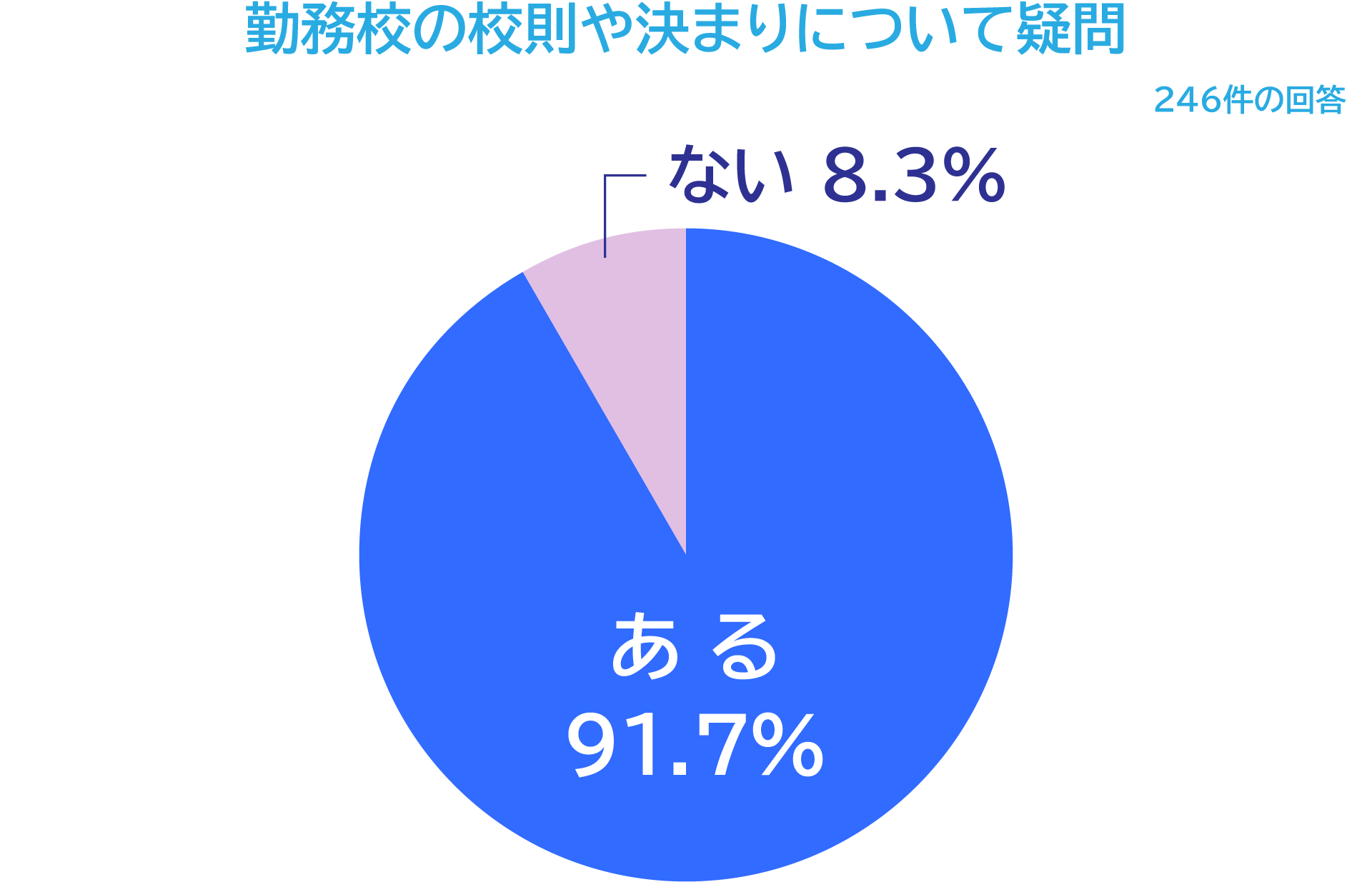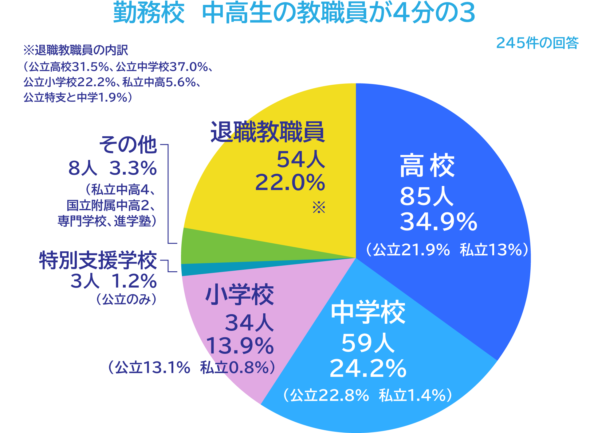 回答数は246件。現役8割、退職2割の比率でした。中学高校の教職員が退職者も含め四分の三を占めました。多くの教職員は少なくない疑問や矛盾を感じつつ校則を運営してきた面があります。そんな複雑な思いをかかえつつアンケートに応じてくださった教職員のみなさんに心から感謝します。