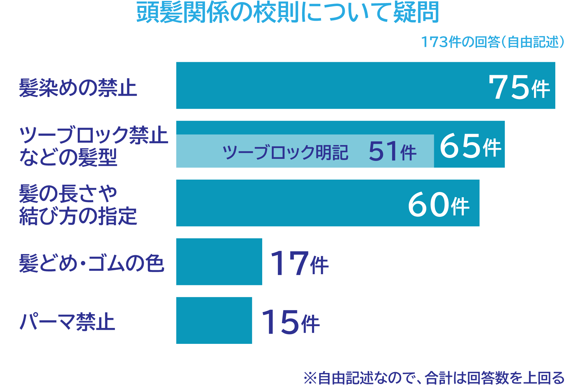 〇ツーブロックなどの髪型の制限は校内の秩序を守るという目的があるため言及しにくいが、そもそも男子・女子規定の髪型があるということ。男女差別を無くすためには幼少期からそういった差別的な事をさけ、偏りのない教育をすべきなのに、未だに何をやっているんだと。
