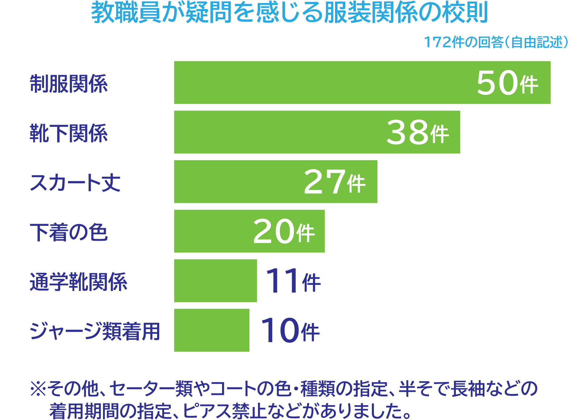 校則への疑問は記述式で書いてもらいました。選択式でないので回答をきれいに数値化することはむずかしいです。上の棒グラフの表は、教職員の回答からいくつかのカテゴリーをこちらで設け、分類してみた結果です。