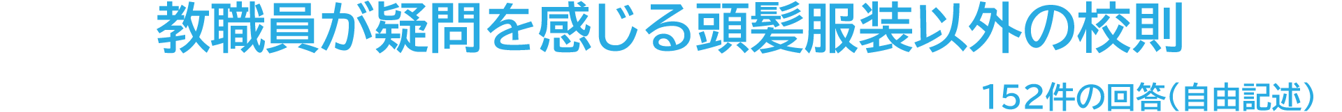 9割以上の教職員が校則に疑問を感じていました。アンケートではさらに、「頭髪」「服装」「それ以外」の三つの分野に分けて疑問を感じる校則(勤務校の)を自由記述で書いてもらいました。「頭髪」と「服装」には7割の、「それ以外」には6割の教職員が書き込みました。以下、それぞれ紹介します。