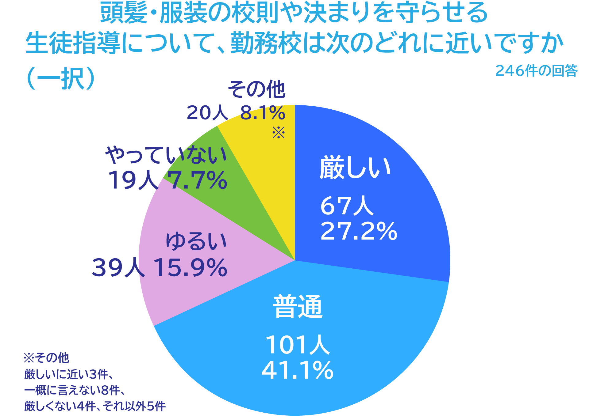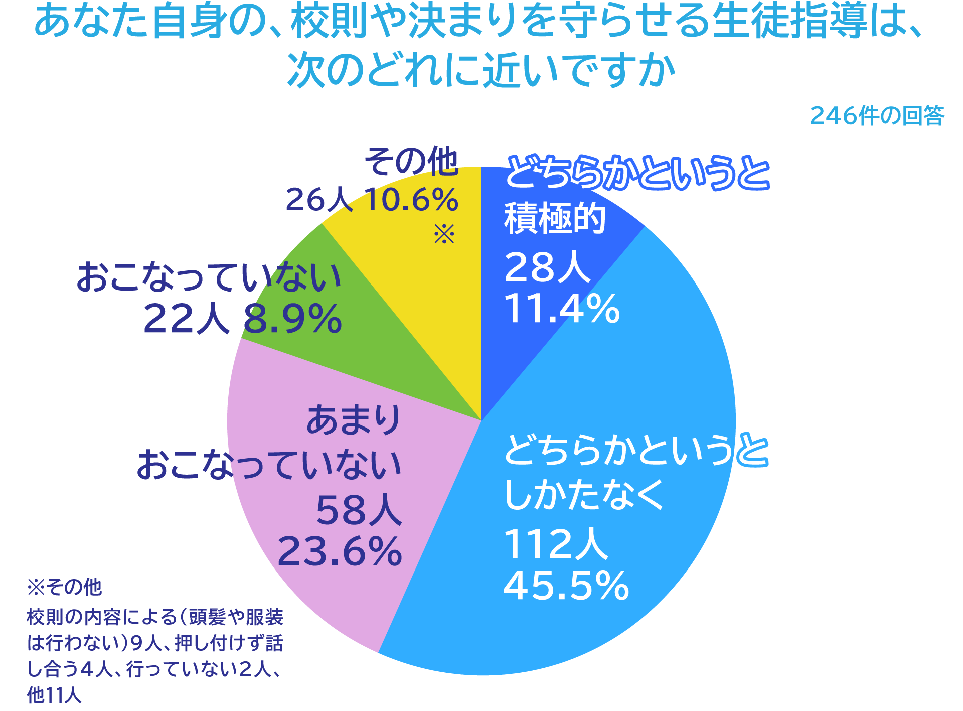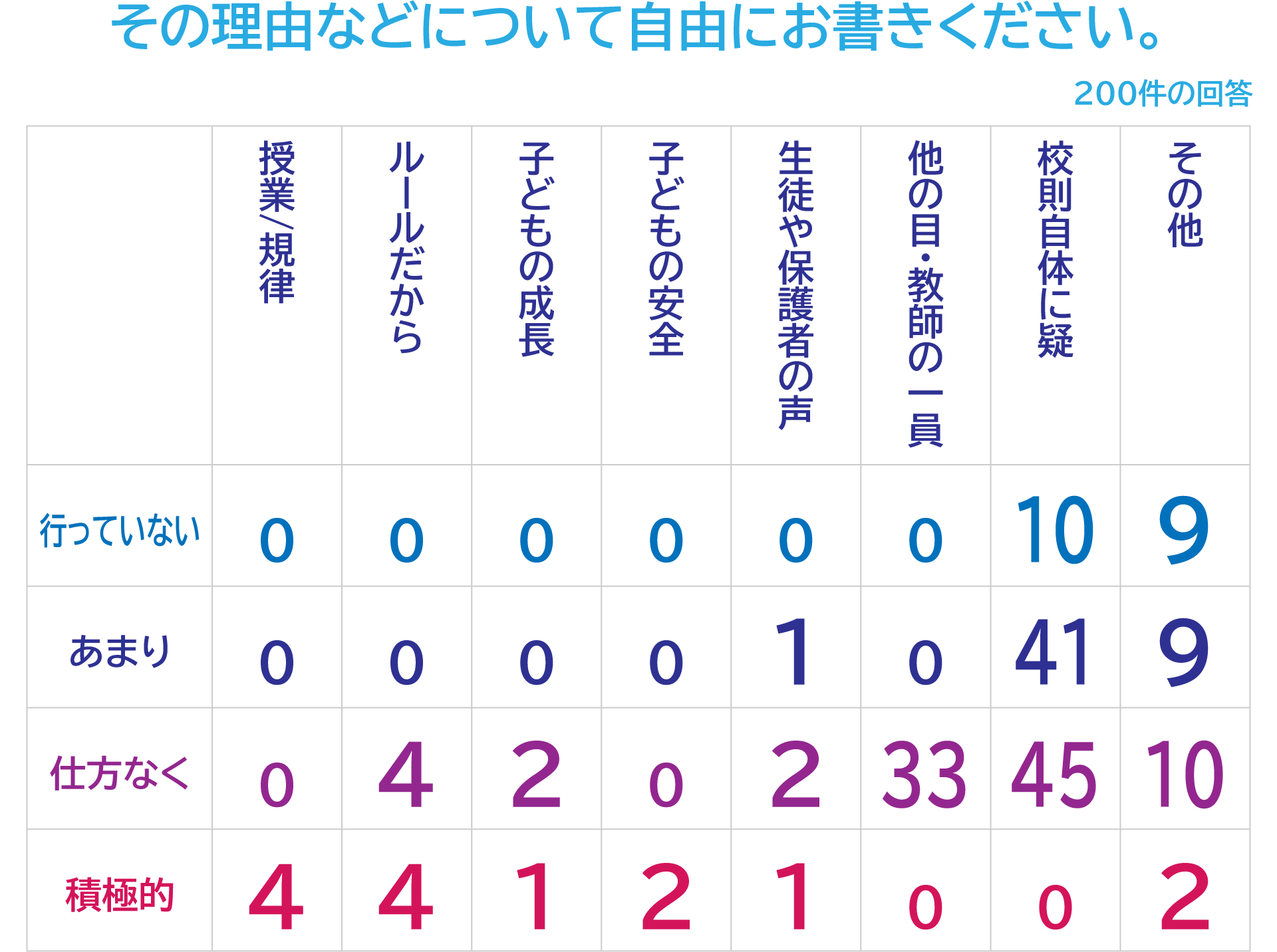 校則指導を「積極的」から「行わない」までのそれぞれの教職員の理由も特徴的でした。