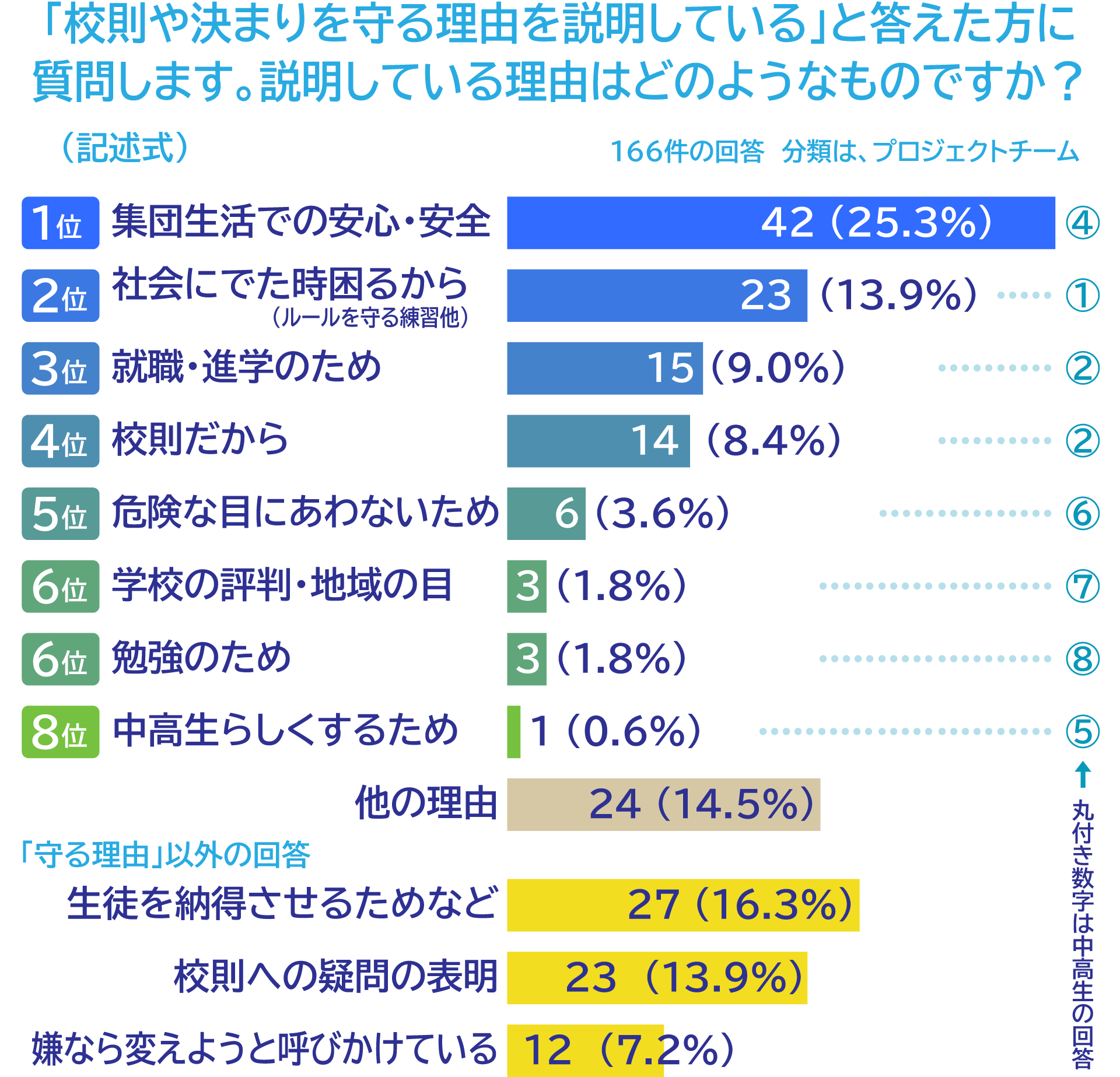 次に、生徒たちに説明している「校則を守る理由」を記述式で書いていただきました。それらを私たちなりに大まかに分類してみましたが、項目的には中高生アンケートでの回答にほぼ対応していました。ただし順位はやや異なり、例えば教職員で一位の「集団生活での安心・安全」は、中高生では4位でした。かつ、その記述を読んでいくと「互いの自由を尊重し人権を大切にする上では行動が制限されることがある」といった、生徒の人権からの説明が一定あることが目を引きました。こうした人権からの説明は中高生の回答ではなかったものですが、生徒が納得できる可能性の高いものかもしれません。