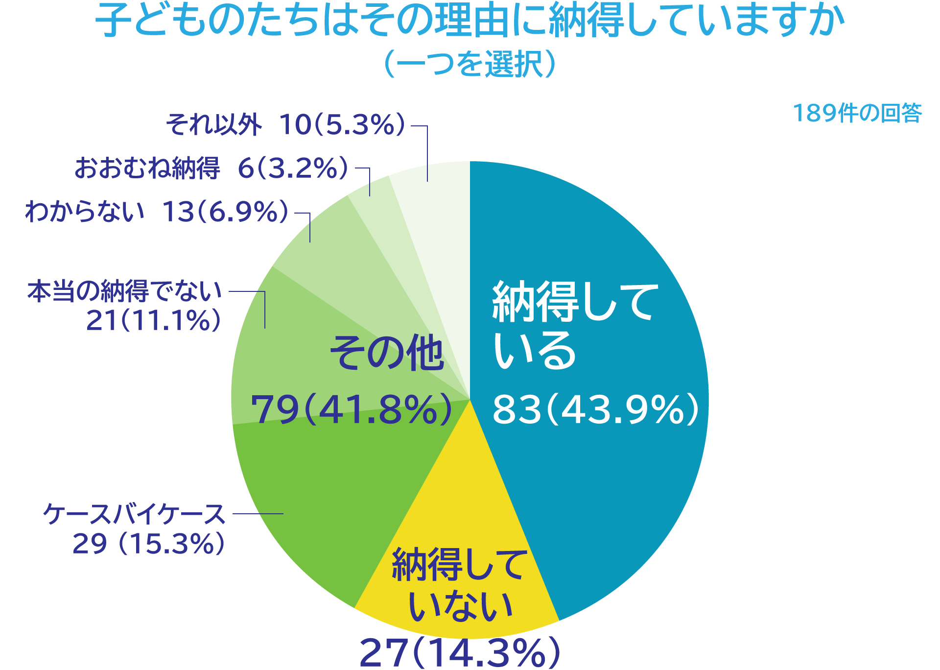 説明に生徒は納得しているのか?回答した教職員の4割以上は、生徒たちは「納得している」と回答しました。「納得していない」は14.3%です。中高生アンケートでは「納得していない」が7割でした(母集団が異なるので単純な比較はできませんが)。注目されるのは、納得している/していない以外の「その他」を選んだ教職員が4割以上あったことです。「ある意味、無理やり納得させていたと思います」「生徒による」「ケースバイケース」などが多くありました。教職員たちが回答した「納得」は微妙なものといえそうです。回答した教職員の九割以上が勤務校の校則に疑問をもっていることを考えれば、その微妙さはある意味で当然かもしれません。「(生徒は)ほぼ納得しますね。『納得できない教員』が重たい課題です。」とは、ある教員の回答です。