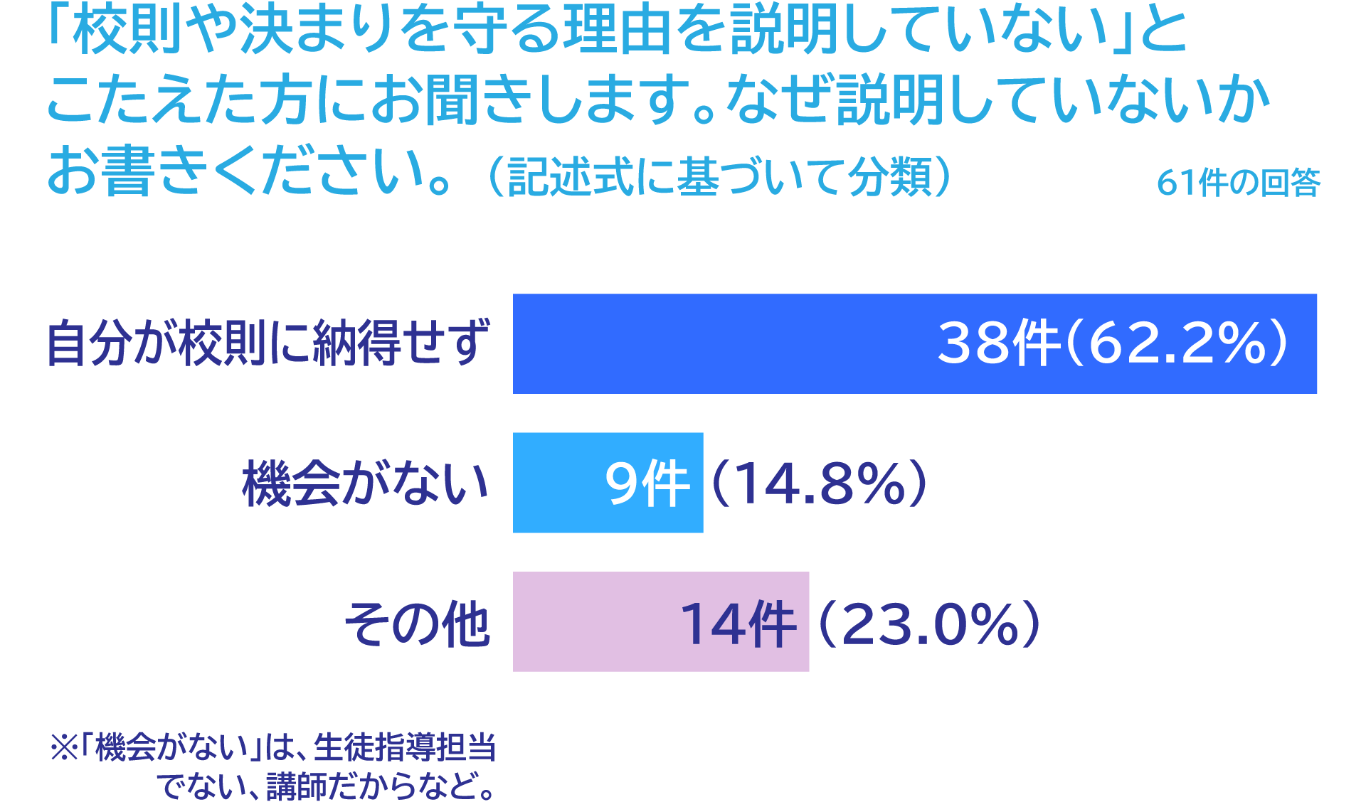 説明していないと回答した教職員には、その理由を尋ねました。その多数は、「自分が校則に納得していないから」という先生たちでした。「人権侵害に加担したくない」という回答もありました。そういう説明は生徒指導担当の教員の仕事であり、自分は関わらないという回答もありました。