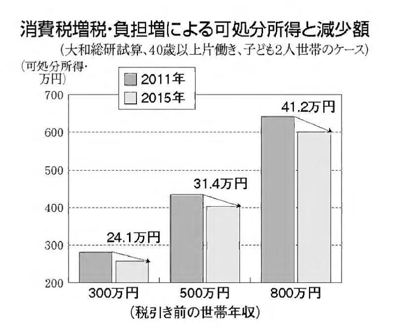 負担増はそれだけではありません。民主党政府は、マニフェストでかかげた子ども手当など、子育て支援の公約を次々と投げ捨てました。今年から、それらによる負担増、増税がかぶさってきます。消費税10%への増税と合わせると、子ども2人、専業主婦と40歳以上の夫、年収300万円の世帯で年24万円、年収500万円で年31万円以上も可処分所得(税や保険料を除いた分)が減ると試算されています(大和総研2011年)。