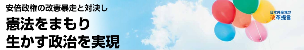 幸福追求権、生存権、両性の平等、労働者の権利、教育の平等―日本国憲法は30 条にわたる、世界でも先駆的で豊かな人権条項をもっています。憲法が「時代に合わない」どころか、憲法を踏みにじってきた自民党政治こそ「時代おくれ」になっています。日本共産党は、憲法の前文も含む全条項をまもり、国政の各分野に生かします。 「国防軍」、人権制限...時代錯誤の自民党改憲案昨年発表された自民党改憲案。「国防軍」創設と海外派兵が明記されています。基本的人権を「侵すことのできない永久の権利」とした97条は全面削除。表現・結社の自由などの基本的人権も、「公益及び公の秩序」に反しない範囲でしか認めないとしています。国民に人権停止と服従義務を課す「緊急事態令」、戦前さながらの「家族」条項、地方自治の理念の否定...... 憲法の平和的民主的条項の全面破壊を許すわけにはいきません。 ![]() 辺野古への巨大基地の建設、オスプレイ配備、海兵隊の大幅増強など、沖縄県民の総意を踏みにじり、在日米軍の強化がすすめられています。沖縄県民と日本国民を危険にさらす暴挙を許すわけにはいきません。 沖縄県民の総意を踏みにじる