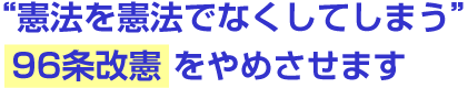 安倍首相は、「96条ならハードルは低い」という思惑から、改憲発議を国会議員の「3分の2以上」から「2分の1以上」に引き下げようといいだしました。"国民が権力を縛る" "時の権力の都合で勝手に憲法を変えさせない"という立憲主義を否定する暴挙に、「9条改憲」に賛成の人からも批判の声が上がっています。日本共産党は、国民的な共同でこのたくらみを断念においこむため奮闘します。