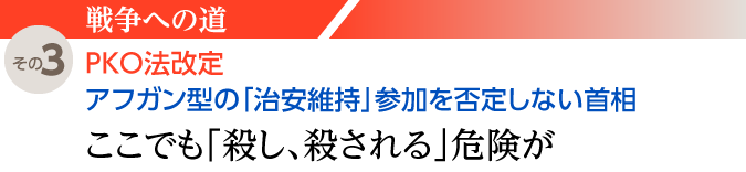 2001年から13年間、アフガンで活動したISAFは、米軍主導の「対テロ」掃討作戦と渾然一体となり、3500人もの戦死者を出しています。ISAFの活動は、アフガンの治安維持部隊を支援するRS任務(「確固たる支援」任務)として、現在も引き継がれています。ここに、憲法9条をふみにじって、自衛隊を「殺し、殺される」戦闘に参加させる、もう一つの危険な道があります。