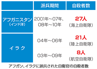 「非戦闘地域」ですら深刻な被害「いつ何が飛んでくるか、怖かった」「警備を交代しても寝られない」─睡眠障害や不安を訴えた隊員が3割をこえる部隊も。「非戦闘地域」を建前としていたアフガン・イラク派兵でもこれだけの犠牲者です。「戦闘地域」に日本の若者を送るわけにはいきません。 |