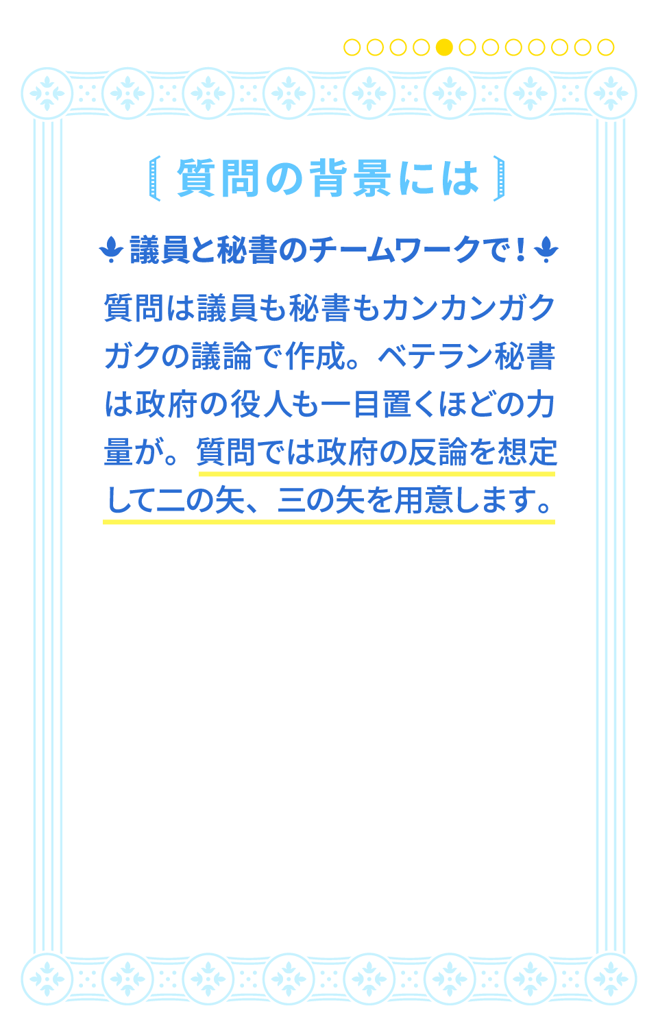 質問の背景には議員と秘書のチームワーク - 質問では政府の反論を想定して二の矢、三の矢を用意します。