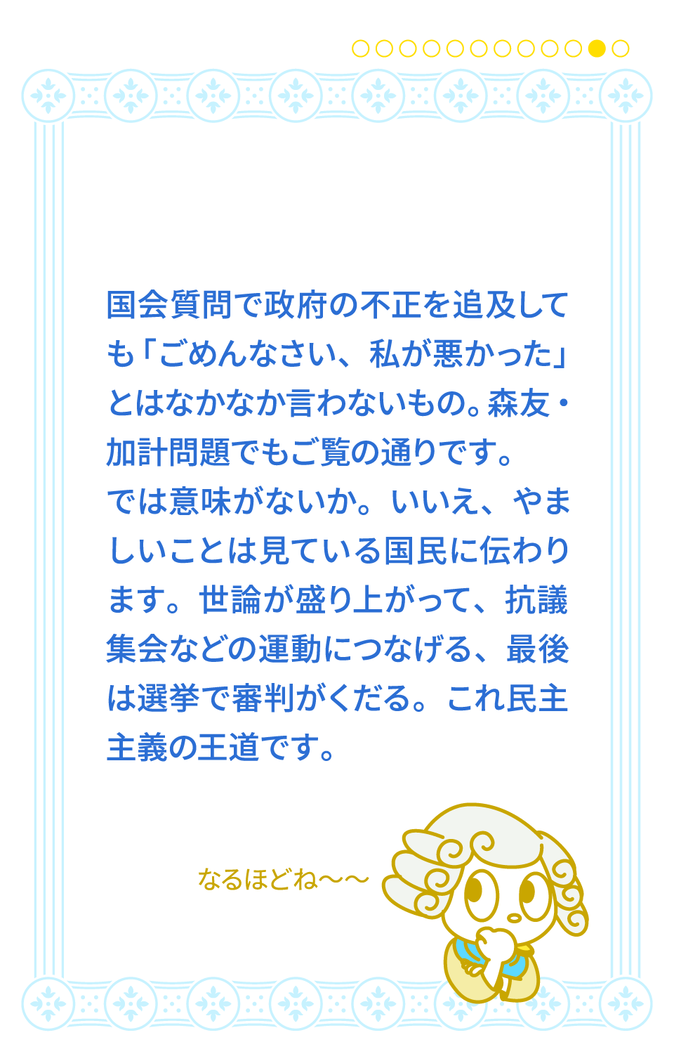 世論が盛り上がって、抗議集会などの運動につなげる、最後は選挙で審判がくだる。これが民主主義の王道です。