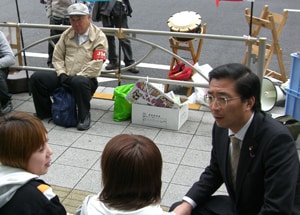 ※写真=日本トムソン本社前で直接雇用を勝ち取った青年労働者を激励対話する山下議員
